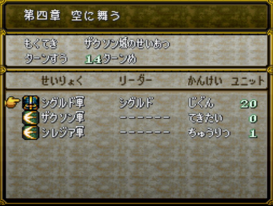 もしくは踊りでデューを再行動で後退させ、橋にシグルドを置く。次ターンに群がったアーマーを倒しマイオスまでの道を開き突撃させる。攻撃後の移動で南か西に2歩移動できるはず。橋から西に2マスの位置に居たシルヴィアもギリギリ届くはず。再行動させて倒し制圧。写真は14ターンで制圧できた画面。